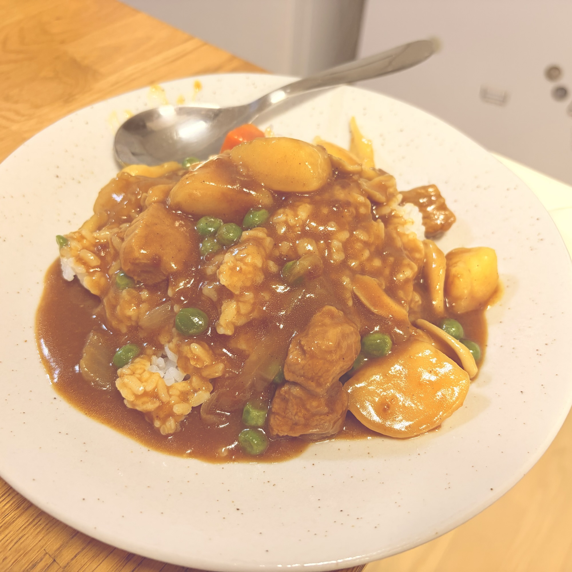 言歸正傳,咖喱飯可謂日本的「國民料理」。學校的家政課多半會教授其基本做法,對武田爸爸而言,亦屬拿手好菜。若由我下廚,通常會將所有配料切得大小相仿;而武田爸爸則頗具個性——大顆馬鈴薯對半切,小顆的甚至整顆入鍋;胡蘿蔔只放少許,還切得細小,一看便知其偏好所在。