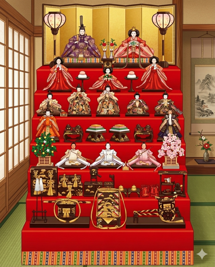 • 最頂端(親王): 擺放著象徵天皇與皇后的男雛與女雛,祂們身著多層華麗的西陣織衣裝,象徵著幸福美滿的良緣。
