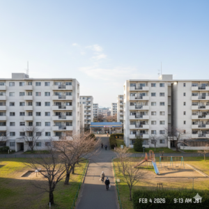 作為國家公務員,武田爸爸的工作單位會為其家庭分配公務員宿舍。依其職級,我們可分配到的房型多為 3DK 或 4K,實際可使用面積約五十多平方公尺。房屋型式屬於日本常見的「團地」——也就是日本經濟高速成長期大量興建的老式公寓社區,多半沒有電梯,樓高約四至五層。